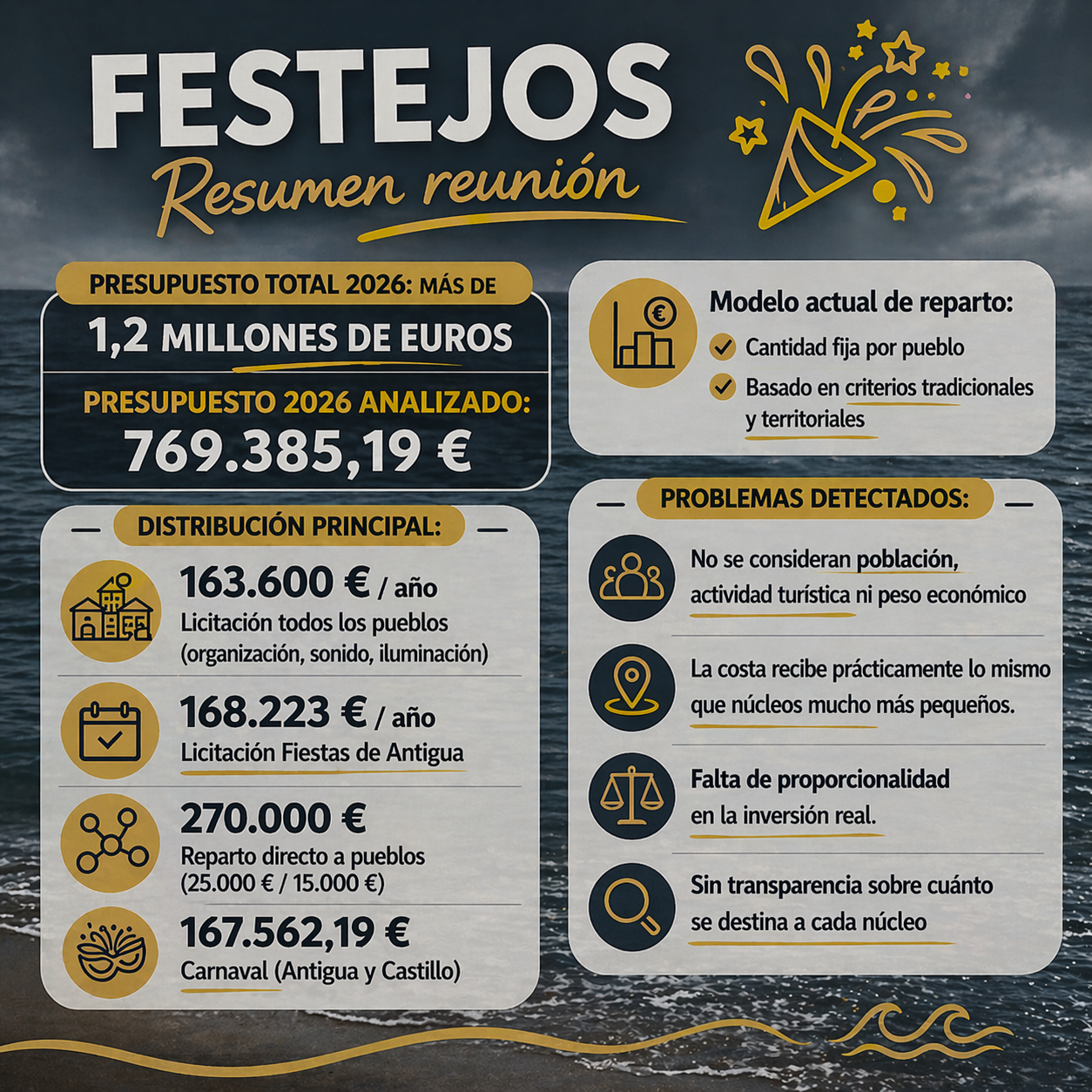 En el marco de las reuniones impulsadas por la Mesa de Seguimiento, se ha mantenido un encuentro de trabajo con la concejalía de Festejos del Ayuntamiento de Antigua, con el objetivo de analizar el modelo actual de reparto presupuestario y trasladar las principales preocupaciones detectadas en la costa.